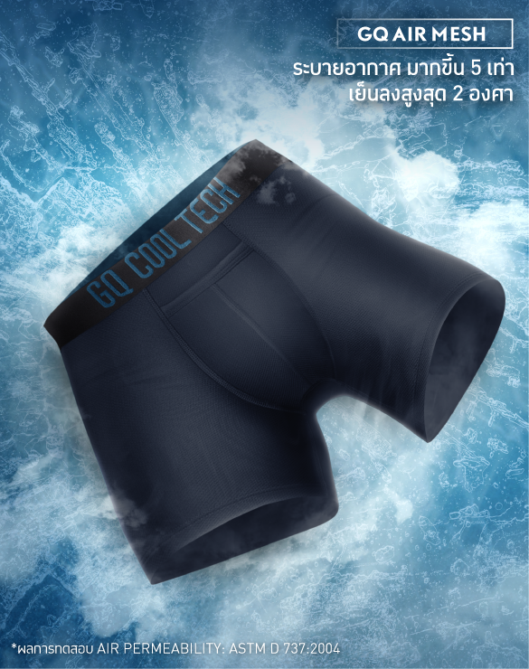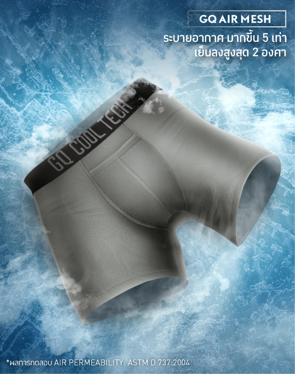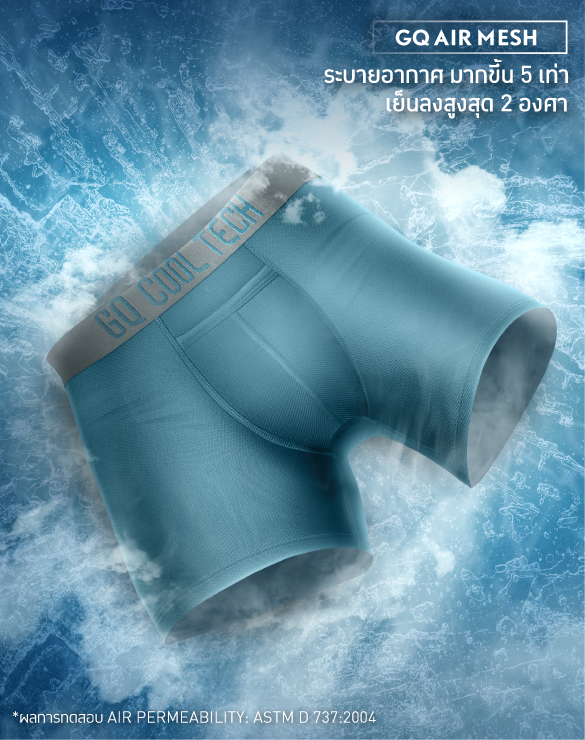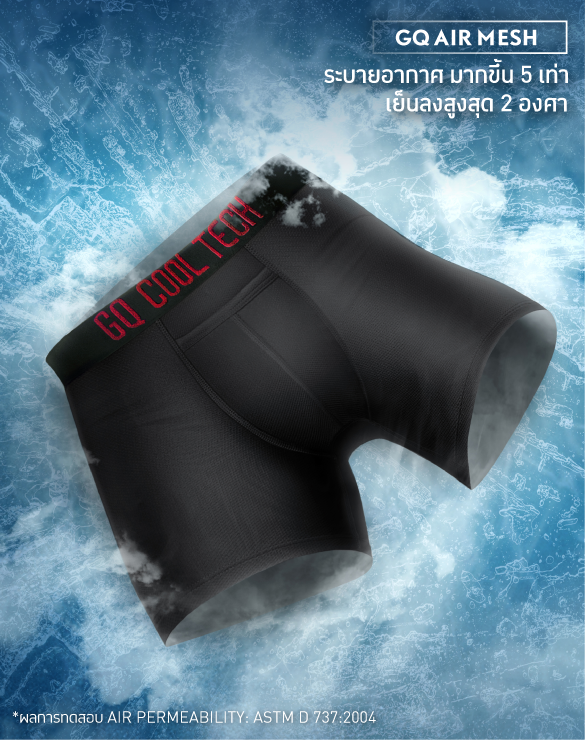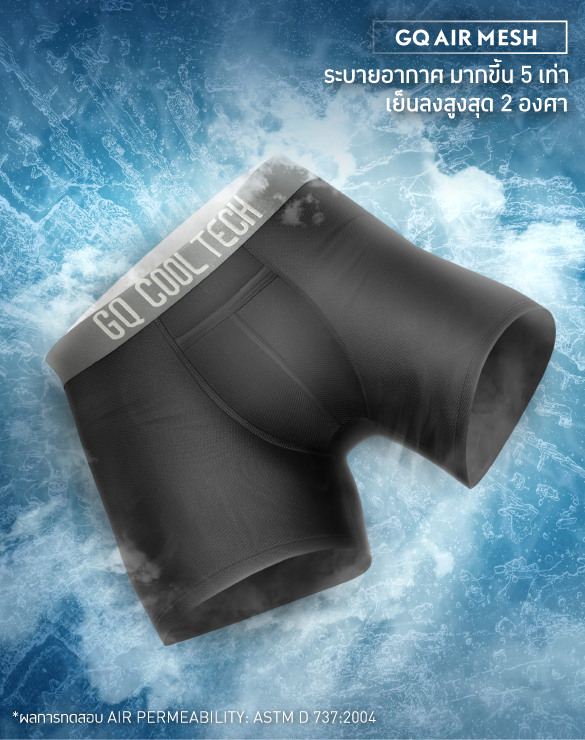 GQ จึงผลิตกางเกงในที่ตอบโจทย์กลุ่มเป้าหมายด้วย GQ Airmesh ผ้าระบายอากาศ 5 เท่า พร้อมเพิ่มตัวช่วยพิเศษ GQ Signature Loop ห่วงแขวนตากง่าย สะดวกพกพา GQ Longer Inseams ขาไม่ม้วน ยาวกว่าปกติ 2 นิ้ว และ GQ Pouch เปลอุ้มไข่ ลดการเสียดสีขณะทำกิจกรรม และยังคงนวัตกรรม GQ Cool Tech™ หมึกผสมเจลเย็นพิมพ์ลงบนใยผ้า ช่วยให้ไข่คุณเย็นลงสูงสุด 2°C