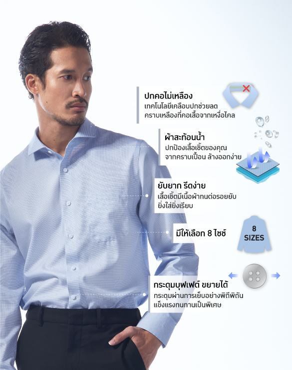 เสื้อเชิ้ตแขนยาว ปกเสื้อทรงป้าน เสริมลุคให้ดูสมาร์ท เนื้อผ้ายับยากรีดง่าย กันเปื้อนล้างออกง่ายด้วยน้ำเปล่า