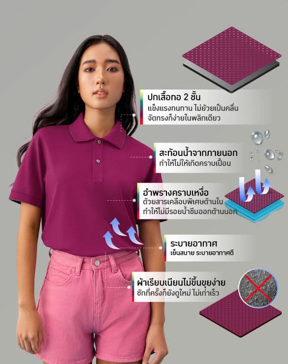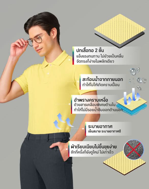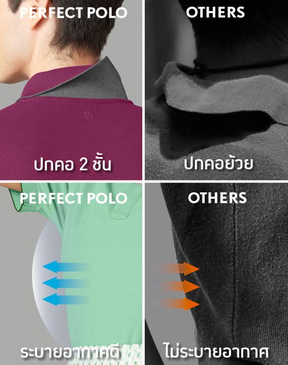 GQ PerfectPolo™ ที่สุดแห่งเสื้อโปโล คอลเลกชันใหม่สีล่าสุด ผ้าสะท้อนน้ำด้านนอกแต่ซับน้ำด้านใน อำพรางคราบเหงื่อ ระบายอากาศดี มีนวัตกรรม GQ Collar ปกเสื้อทอหนาพิเศษเพื่อความคงทน เรียบนาน ไม่ย้วยง่าย สัมผัสเนียนนุ่ม หุ่นหมีก็มีไซซ์ ใส่ได้ทั้งผู้ชายและผู้หญิง